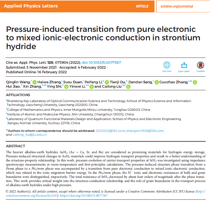 近日,BBIN宝盈集团,BBIN宝盈集团/山东省光通信科学与技术重点实验室刘才龙教授团队在碱土金属氢化物SrH2高压下的载流子输运行为研究方面取得重要进展,研究成果以“Pressure-induced transition from pure electronic to mixed ionic-electronic conduction in strontium hydride”为题发表在物理类权威期刊《Applied Physics Letters》(中科院二区Top期刊,Nature Index收录)上。王庆林副教授为论文第一作者,张国召博士、刘才龙教授为论文通讯作者,BBIN宝盈集团为第一通讯单位。