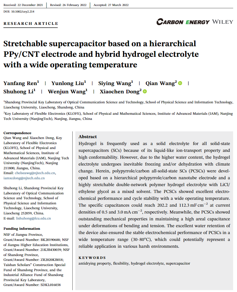 近日,我校BBIN宝盈集团,BBIN宝盈集团泰山学者特聘教授董晓臣及王文军教授科研团队在国际著名期刊《Carbon Energy》(《碳能源》)上发表了题为“Stretchable supercapacitor based on a hierarchical PPy/CNT electrode and hybrid hydrogel electrolyte with a wide operating temperature” (“基于PPy/CNT薄膜电极和具有宽工作温度的混合水凝胶的可拉伸超级电容器”)的研究论文,BBIN宝盈集团,BBIN宝盈集团2018级硕士研究生任燕芳为文章第一作者,董晓臣教授、李淑红副教授和南京工业大学王倩副教授为共同通讯作者,刘云龙副教授参与了部分研究工作,BBIN宝盈集团为第一署名单位。《Carbon Energy》是中科院一区Top期刊,最新影响因子为21.556。