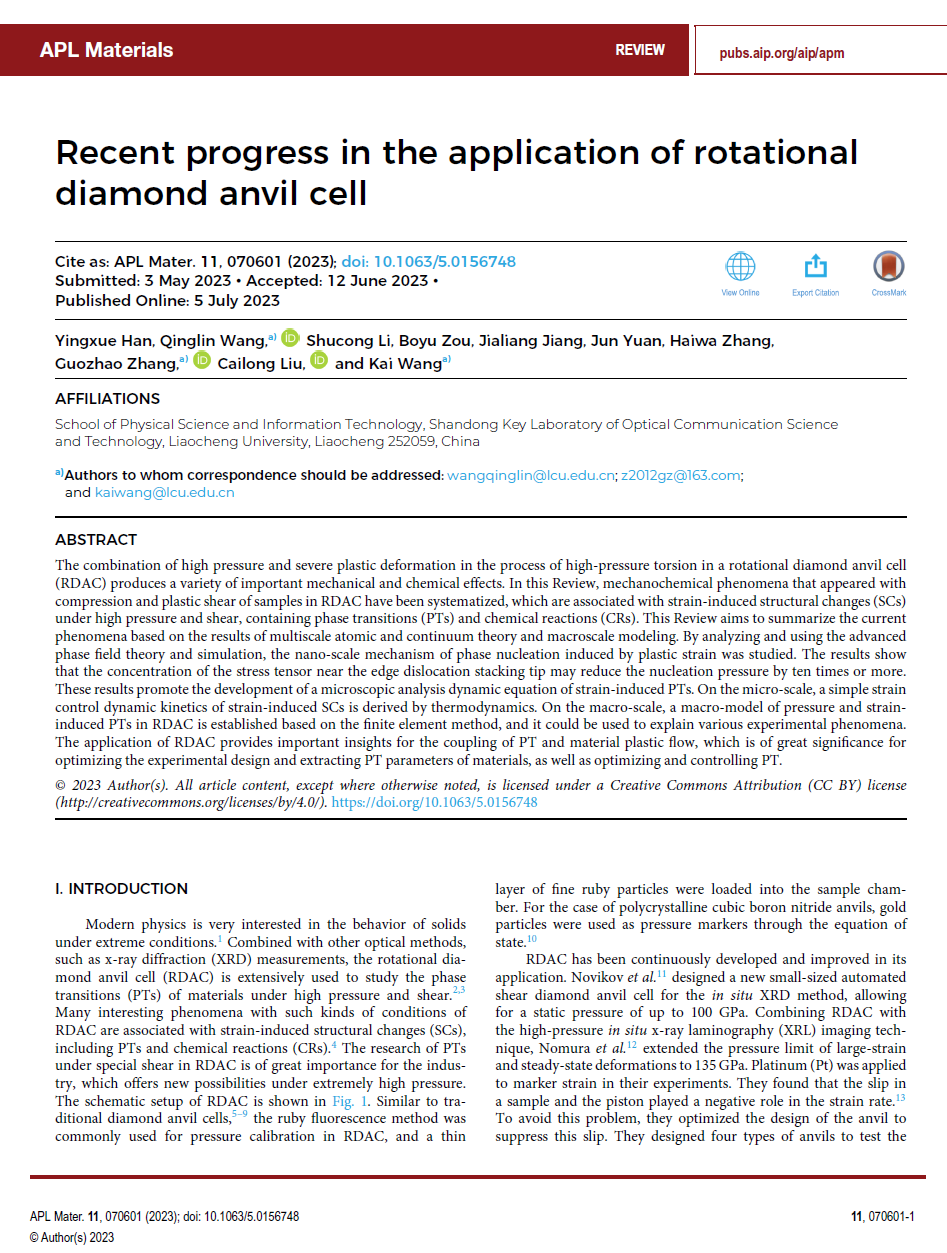 近日,BBIN宝盈集团,BBIN宝盈集团泰山学者青年专家王凯教授团队指导本科生在《APL Materials》(中科院二区,影响因子6.1)上发表了题为“Recent progress in the application of rotational diamond anvil cell(旋转金刚石对顶砧技术的最新应用进展)”的综述文章。2020级物理学专业本科生韩莹雪为文章第一作者,王庆林副教授、张国召博士、王凯教授为共同通讯作者,刘才龙教授、张海娃博士,研究生邹博宇、姜家梁,本科生李树聪、袁骏共同参与了该工作,BBIN宝盈集团为唯一署名单位。