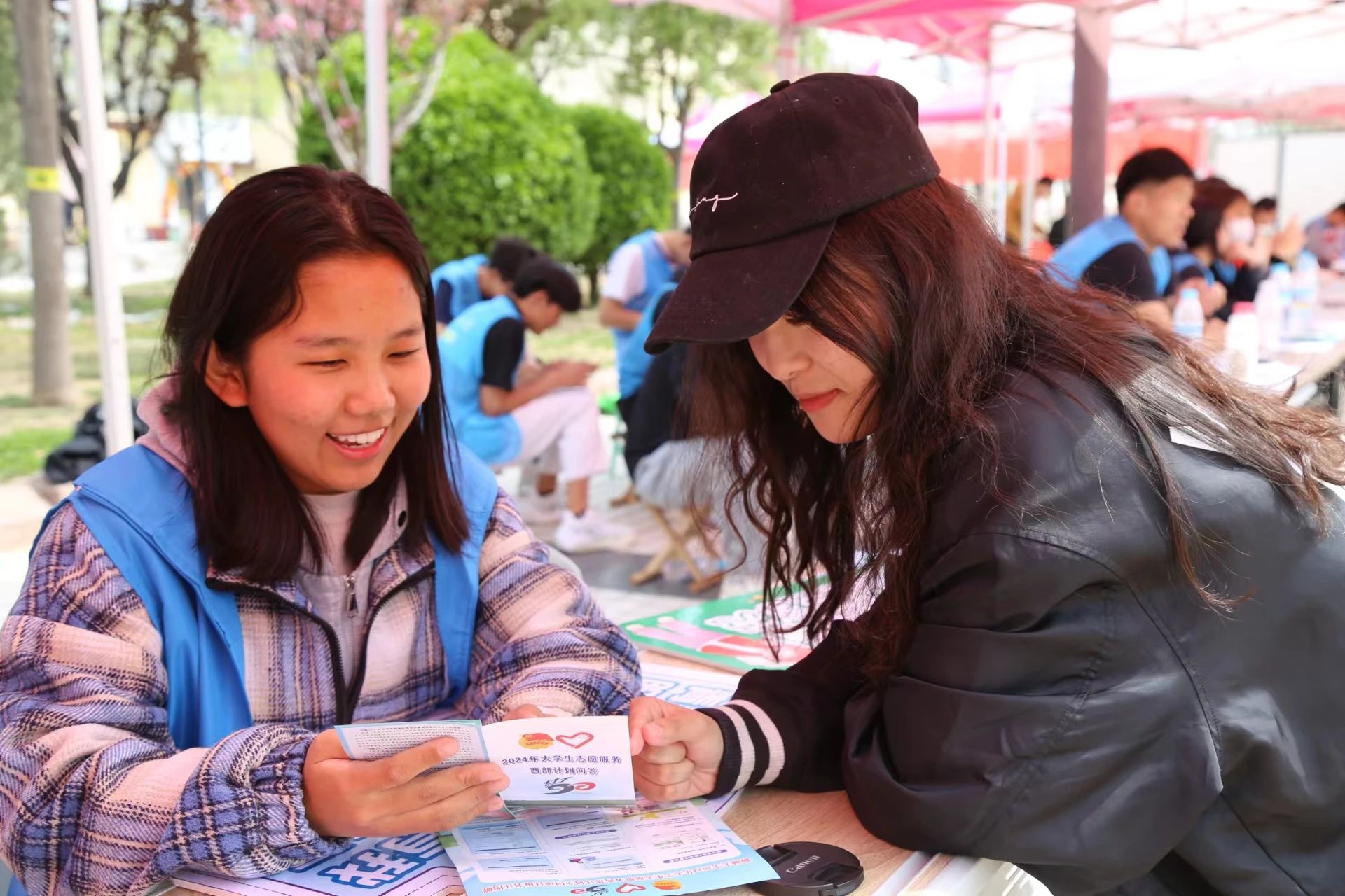 活动现场,志愿者们通过发放西部计划宣传册的方式向同学们介绍了西部计划的报名条件、项目设置和报名流程等内容,并与同学们进行了热烈交流,耐心、细致地解答了大家的焦点困惑。无论是即将毕业的24届学长学姐,还是尚未毕业、来寻找将来就业方向的学弟学妹,“到西部去,到基层去,到祖国需要的地方去”的号召,引得他们纷纷驻足。22届西部计划志愿者金鲁哲也从新疆来到现场,为大家分享西部计划相关政策、服务经历和参与感受等,并对咨询者提出的困惑进行了详细解答。