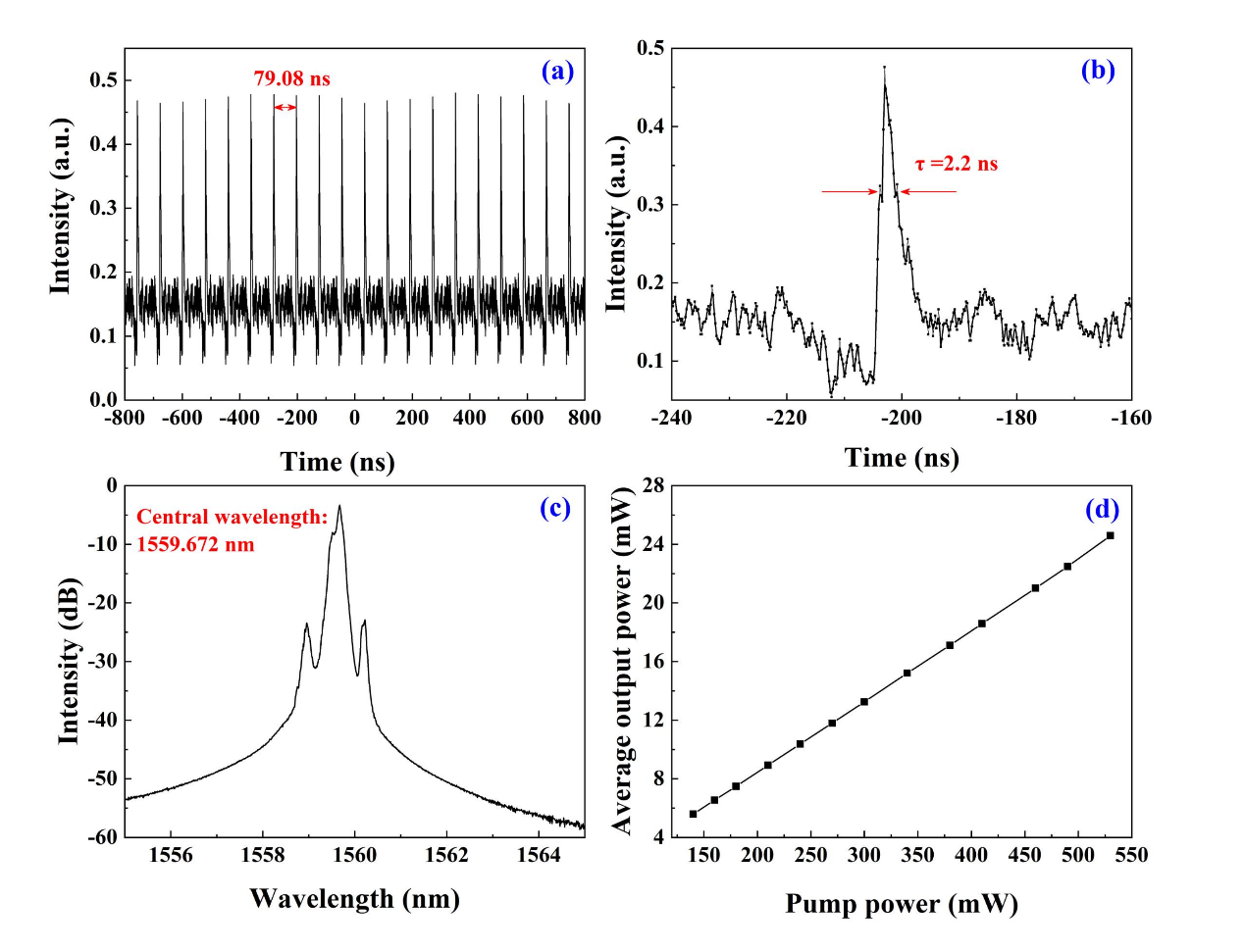 图1 锁模性能 (a)脉冲序列;(b)单脉冲图;(c)光谱图;(d)输出功率与泵浦功率的关系图