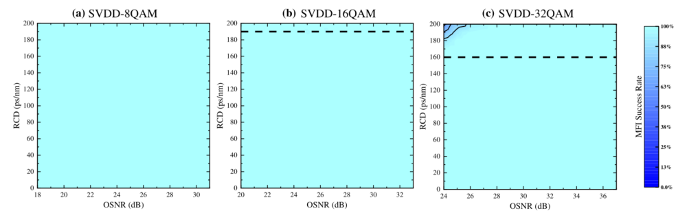 图2 (a)SVDD-8QAM,(b)SVDD-16QAM和(c)SVDD-32QAM在不同OSNR和RCD值下的MFI成功率
