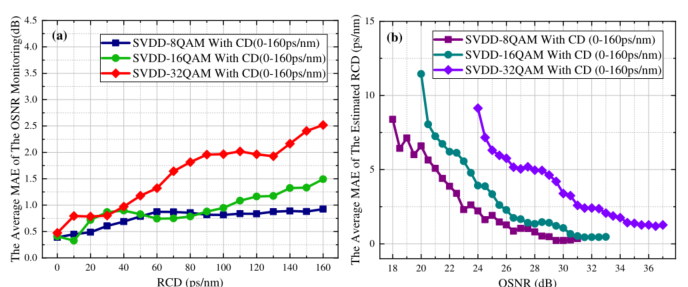 图3 (a)OSNR监测与RCD的平均MAE和(b)估计RCD与OSNR的平均MAE
