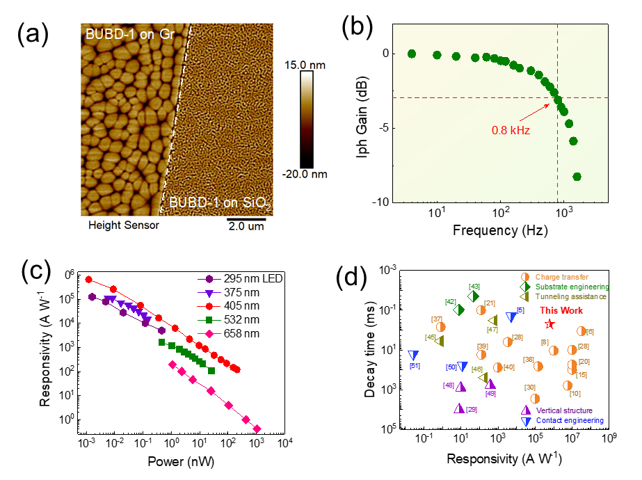 高速、高灵敏的光电探测在光通信等领域具有重要应用价值。在这项工作中,通过传统有机蒸镀技术,实现了BUBD-1小分子在石墨烯表面的自组装,显著增强了薄膜对光子的吸收能力,引入强光导增益并借助石墨烯高迁移率优势,实现了器件高响应度和灵敏度:7×105 A/W和1.3×1012 cm Hz1/2 W-1。通过调控界面电场和石墨烯载流子类型和密度,实现了330/490 μs的快速响应时间。该工作表明,有机杂化薄膜在未来大规模集成光电探测领域具有巨大潜在应用价值。