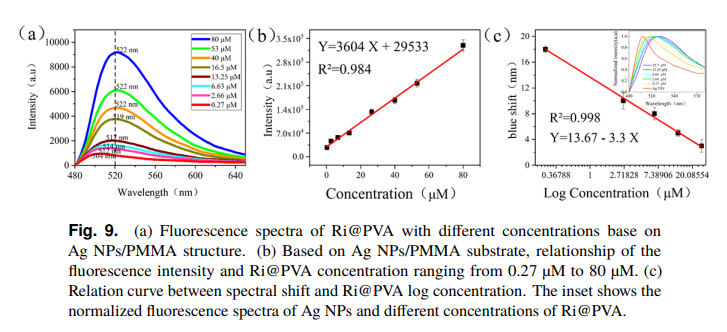 在“Ag NPs/PMMA nanocomposite as an efficient platform for fluorescence regulation of riboflavin”论文中,利用等离子体增强荧光和荧光光谱位移两种方式实现了核黄素的检测。核黄素是我们身体不可或缺的一部分,其含量可用于判断身体健康状况,光敏性可用于判断食品是否过期,药理特性可用于治疗炎症、心绞痛和其他疾病。面对诸多领域的应用,核黄素的检测必不可少。荧光检测法因核黄素拥有天然的荧光响应而具备优势。本工作中,课题组报道了一种基于Ag NPs和PMMA协同效应的荧光检测平台。引入Ag NPs以实现等离子体增强荧光,薄PMMA层不仅通过增强基底的粘附来增强荧光,还可用作间隔物来优化等离子体增强荧光效应。基于该平台实现了核黄素的检测,最低可检测浓度低至0.27 μM,除了基于等离子体增强荧光的检测之外,低浓度的核黄素的检测也可以通过由于Ag NPs引起的荧光峰的移动和加宽来实现。该平台在荧光分子检测和光学传感领域具有巨大的应用潜力。