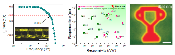 本工作利用大气环境升华技术制备了高质量的并五苯单晶,将其与高迁移率的石墨烯耦合构筑异质结,实现了105A/W的高响应度,通过构筑非对称构型实现了器件的自驱动探测。得益于高质量的异质界面,器件的-3dB带宽提升至26 kHz,这是目前同结构类型探测器的最优值。本研究表明高质量的有机晶体及其异质结是提高光探测器的有效手段,也对开发新型高性能光电探测器打开了一条新的途径。