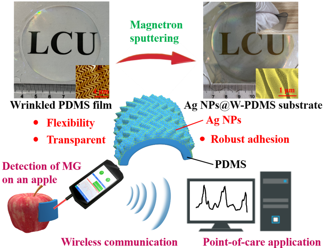 随着柔性SERS基底的发展,SERS技术与小型化拉曼光谱仪结合为即时检测提供了巨大的前景。对于原位检测策略,通过简单且成本低廉的制造方法构建高性能柔性透明SERS基底至关重要。在此,本文利用表面起皱技术和磁控溅射技术,提出了一种制造大面积柔性透明SERS基底的简单方法,该基底由银纳米颗粒修饰的起皱聚二甲基硅氧烷薄膜(AgNPs@W-PDMS)组成。通过使用便携式拉曼光谱仪表征罗丹明6G分子,制备的柔性SERS基底显示出低检测限、高增强因子、优异的再现性以及良好的机械稳定性。为了评估其适用性,本文对苹果和番茄皮上的孔雀石绿进行了原位检测,检测限为10-6 M。此外,文中系统介绍了研究者们研发的无线传输系统。该系统可将手持式拉曼光谱仪收集的SERS光谱数据实时传输到计算机,以便实现信号的快速处理与分析,有助于推动SERS技术在即时检测领域的应用。