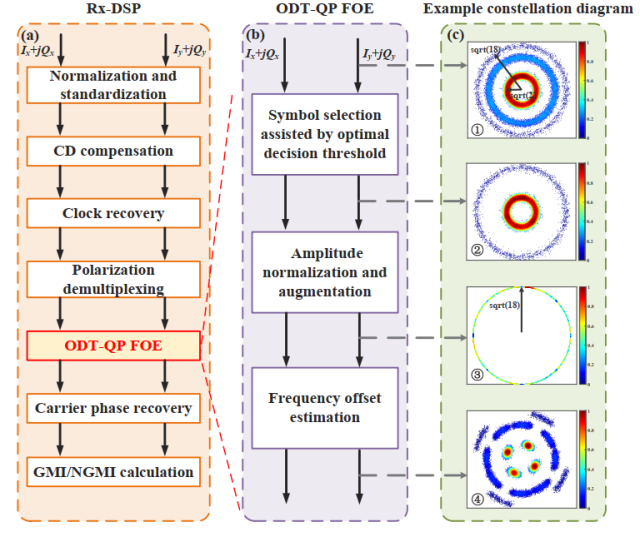 在这项工作中,为了解决目前FOE算法在概率整形系统中所出现的不适用问题,提出了一种新的低复杂度的盲频偏估计方案。首先,该方案利用与PS-16/64QAM圆环半径发生概率密切相关的最优决策阈值方法,降低圆环判断的错误概率。其次,将多个QPSK形环上的接收符号统一增加到相同的值,以消除幅度噪声的影响。最后,采用改进的时域4次方前馈方法估计PS-16/64QAM信号的频偏值。