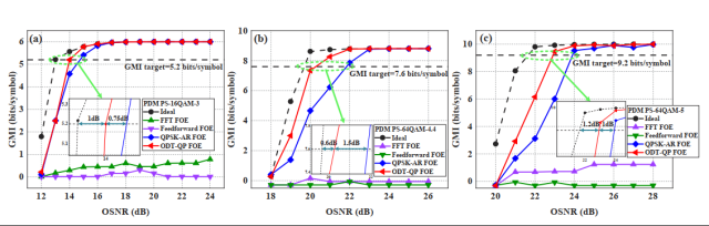 所提出方案的有效性已通过28GBaud偏振分复用(PDM)PS-16/64QAM仿真和28/8 GBaud PS-16/64QAM实验得到验证。该方案的FOE范围可以达到[-Rs/8, Rs/8],其中Rs表示波特率。当OSNR高于16dB和19.5dB时,PS-16QAM-3/3.6的NMSE均低于1e-7。对于PS-64QAM-4.4/5,在OSNR分别增加到20.3dB和23.4dB后,NMSE的值低于1e-6。更重要的是,该方案的整体复杂度可以降低到O(N),最多仅为FFT FOE方案的26.5%。