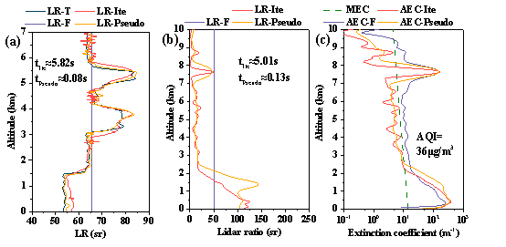 气溶胶激光雷达比是气溶胶光学特性反演的重要参数,影响着气溶胶光学特性反演精度和大气中气溶胶类型的辨识精度。在这项工作中,研究人员提出了一种具有一定普适性的伪常数反演气溶胶雷达比廓线的方法。所提出的伪常数方法避免了畸变消光系数廓线的引入,无需设置气溶胶雷达比值的变化范围,也无需人为控制迭代参数。理论仿真和实验分析均表明伪常数法可获得更准确的气溶胶雷达比廓线,同时可显著提高信号处理效率(每组信号的处理时间从约5秒改进至约0.1秒),并能在一定程度上提高气溶胶类型的识别精度。