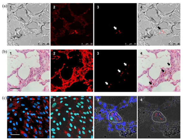 图1. 使用HSA-FND(人血清白蛋白包裹的荧光纳米金刚石)标记的pcMSCs(人胎盘绒毛膜衍生的间充质干细胞)在猪组织中获得了一系列的荧光图像