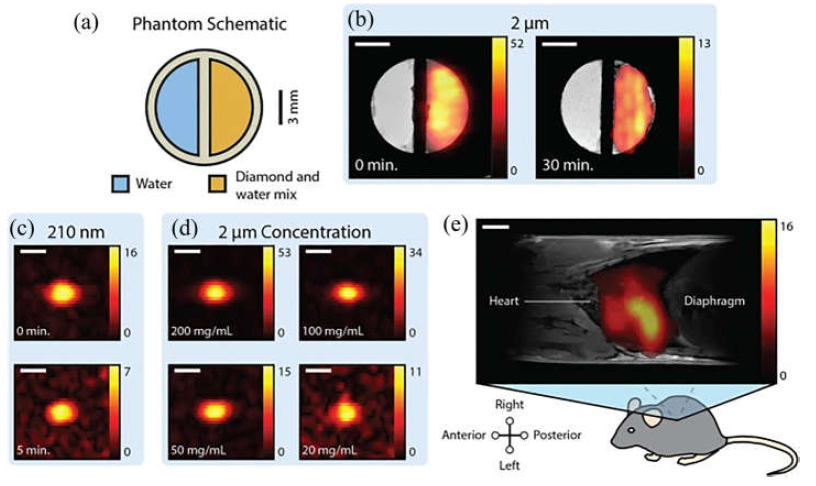 图2. 将超极化金刚石注入小鼠体内,然后对其进行磁共振成像研究,获得了一系列成像