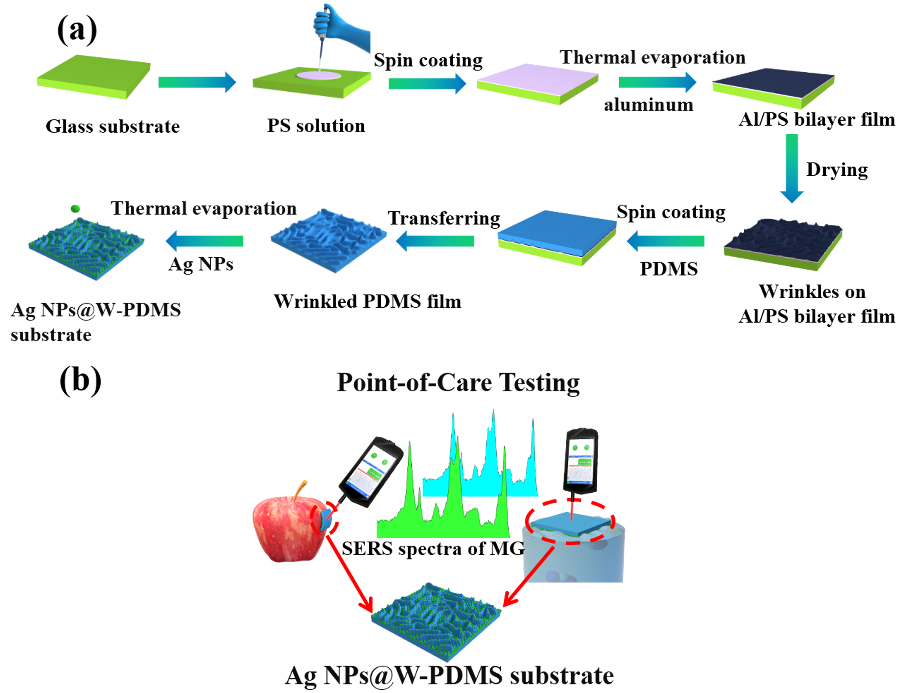 本工作中,研究人员报道了一种基于银纳米颗粒修饰褶皱聚PDMS(聚二甲基硅氧烷)薄膜的柔性透明SERS(表面增强拉曼散射)基底。所制备的SERS(表面增强拉曼散射)基底对罗丹明6G表现出高的增强因子(~1.19×105)、良好的信号均匀性(相对标准偏差RSD=6.27%)和批次间再现性(相对标准偏差RSD=7.3%)。此外,AgNPs@W-PDMS薄膜即使在弯曲或扭转100个循环之后,SERS基底仍保持高的检测灵敏度。更重要的是,Ag NPs@W-PDMS薄膜具有柔性、透明和轻质性的特点,其既可以漂浮在水面上,又可以与不规则表面共形接触。研究表明,水环境和苹果皮上的孔雀石绿可以通过便携式拉曼光谱仪轻松检测到10−6 M。因此,这种多功能的柔性、透明SERS(表面增强拉曼散射)基底在现场、原位污染物监测方面具有巨大的应用潜力。