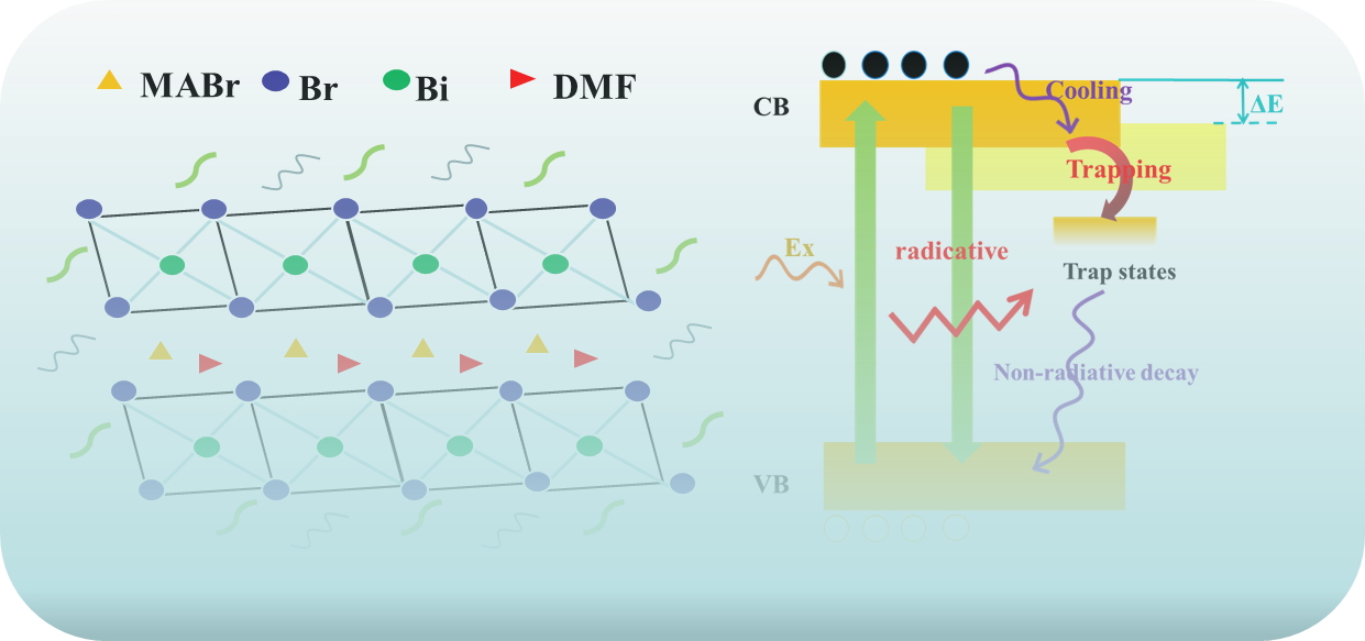 卤化铅钙钛矿量子点由于其优异的光电子特性而成为未来光电器件的候选者。然而,不稳定性和毒性问题限制了它们的进一步发展。本工作证明了掺杂策略可以提高非铅MA3Bi2Br9量子点的光学性能,发现铟离子掺杂可以有效地改善MA3Bi2Br9 量子点的光致发光性能,而不会影响其电子结构。形貌和结构结果表明,In3+掺杂优化了MA3Bi2Br9 量子点的八面体结构。由于量子限域效应,光致发光红移现象与紫外/可见吸收光谱中得到的类似红移现象一致。纳秒瞬态吸收光谱表明,增强的辐射复合过程有助于增强稳定性和发光。MA3Bi2Br9量子点的光致发光量子产率提高至60.7%。本研究为提高无铅钙钛矿量子点的发光性能提供了有效的策略,同时进一步为掺杂非铅钙钛矿量子点的发光机理提供理论基础。